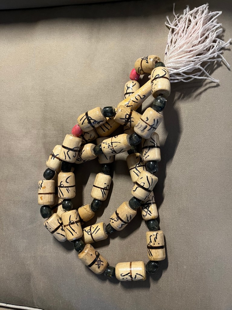 We momentarily veered away from the tourist section and embedded into a crowd of Egyptians, moving down a lane of houseware products. Among the stalls was one selling Islamic prayer beads… My wife was taken with a large wooden ‘misbaḥah’, designed for hanging in a home. Each bead was scribed in Arabic with one of the hundred names of Allah. With some miming and the help of a passerby who knew a few words of English, we persuaded the woman in the stall to sell the beads to a non-Muslim. That artifact–– my wife’s only treasured keepsake from Egypt––now resides in a corner of our living room…