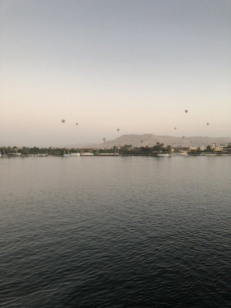 When the sun rose the following morning, I was on the upper deck at the same time as a dozen hot air balloons rose above the desert hills behind the West Bank. My wife and I had declined that opportunity to float over Luxor in a basket. Even if it had been the thrill of a lifetime–– $180 US was just too steep for it. When the others in our group returned from their thrills-of-a-lifetime, we set off for the Valley of the Kings.
