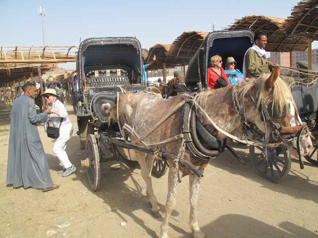 The day before that in Aswan, my wife and I took the horse carriage ride that was included in the tour package. All the passengers from our boat were led to one of the dozens of Egyptian Hantours lined up on the corniche above the quayside. As soon as our turn came to climb into a carriage seat, the attendant whistled like a traffic cop. Thereupon we clip-clopped away at a brisk pace. With the Eid festival still underway, there was excitement in the crowded streets. A few kids waved and called out––some cupping hands as if to receive tossed alms…