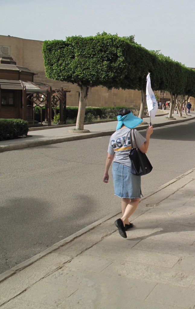 A half hour later in the departure gate, we met our tour guide, Popsy. She was a Chinese Canadian woman of about forty, soft-spoken and serious: not the type one might expect for an Egyptian tour escort. She was holding a flag with the tour company’s new name. That white flag with blue insignia was aimed to guide us over fourteen days through airports, hotel lobbies and the field trips between them.