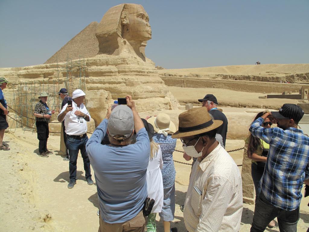 On the morning after arrival in Cairo, we first met Emad, our Egyptian guide. We were waiting in the tour bus outside our first hotel (Movenpick Media City) when he stepped aboard, Wearing the dark sunglasses we rarely saw him without over the following nine days, he was smiling broadly. He began by saying that his English was rusty from disuse over the pandemic shutdown. He then proceeded to show it off–– speaking of his official qualifications and long history as a tour guide, along with his personal interest in Egyptology.