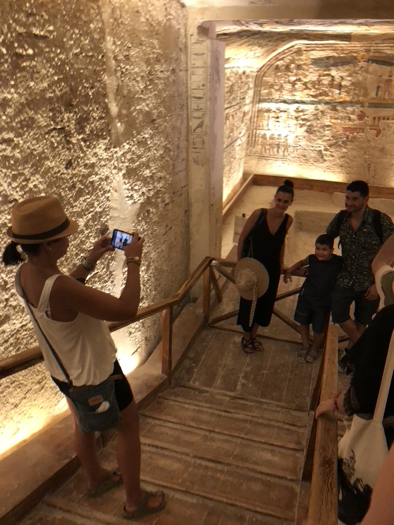 Our mid-morning visit in early May 2022 coincided with visits of no less than twenty other tour groups. German, French and Spanish were heard in the clusters around their leaders’ flags. Still, Popsy said the crowd was half the size as she had seen on earlier tours. Tourism from Japan, Korea and China was apparently still limited by pandemic restrictions. Double the numbers swarming the narrow valley in uniform caps and tee-shirts was not a pleasant imagining. It also occurred that the Pharaohs themselves would not have been amused by such a volume of traffic around their tombs…