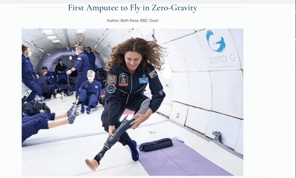 Athletes, musicians, artists and on-line influencers have been featured among the inspirational. The ‘First Amputee in Zero Gravity’ was an attractive female pilot. An Ontario politician was photographed in her office chair smiling broadly. Her bare prosthetic leg stretched out before her reinforced her message: the disabled ‘hero’ has no need whatsoever for wigs, combovers or skin-lightening crème…